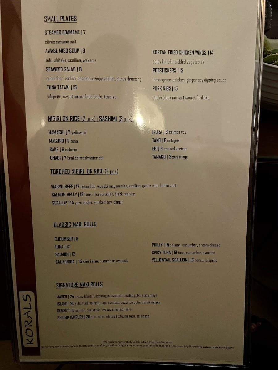 Korals Sushi & Cocktail Lobby Bar Menu brings a relaxed, coastal vibe to 400 S Collier Blvd in Marco Island, and the first thing you notice is how effortlessly the dishes mix freshness with a bit of fun. You’ll find rolls that lean into bright, clean flavors, along with a few that push toward richer, more indulgent bites. And while the sushi is the obvious star, the menu keeps things interesting with small plates that pair nicely with whatever you’re sipping.